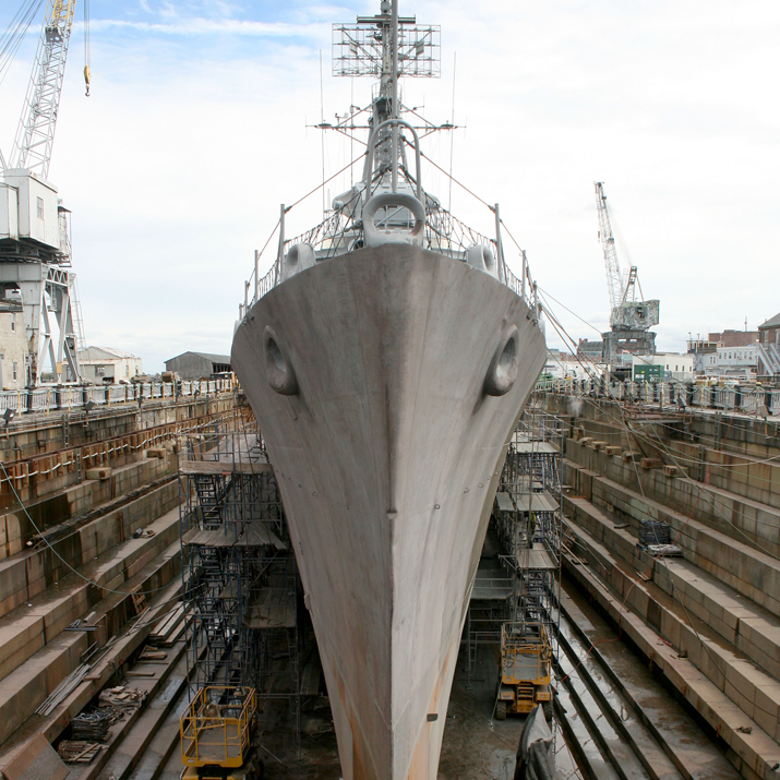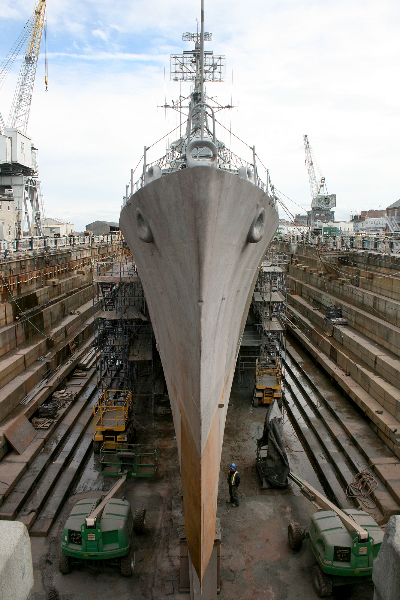 A World War II-era destroyer in the dry dock at the Charlestown Navy Yard.