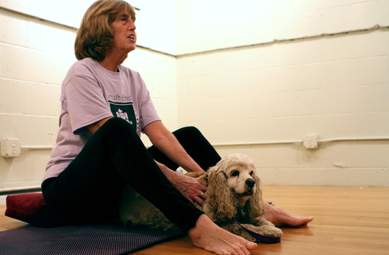 The Yogathon was put together in collaboration with three South End businesses: South End Yoga, the Animal Rescue League, and Katz and Dogz, a holistic animal massage practice run by Arnie Katz, who opened the class with a lesson on canine massage and relaxation.