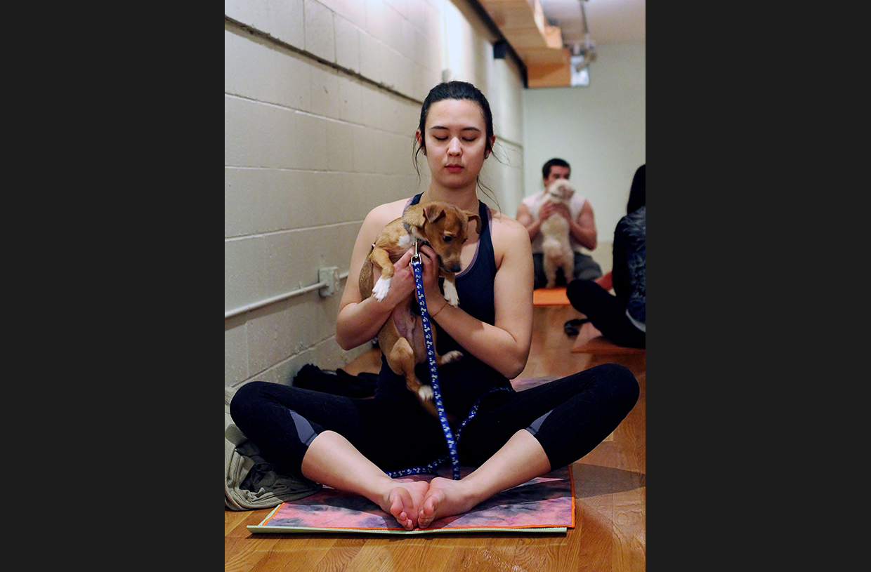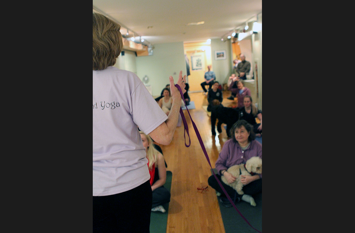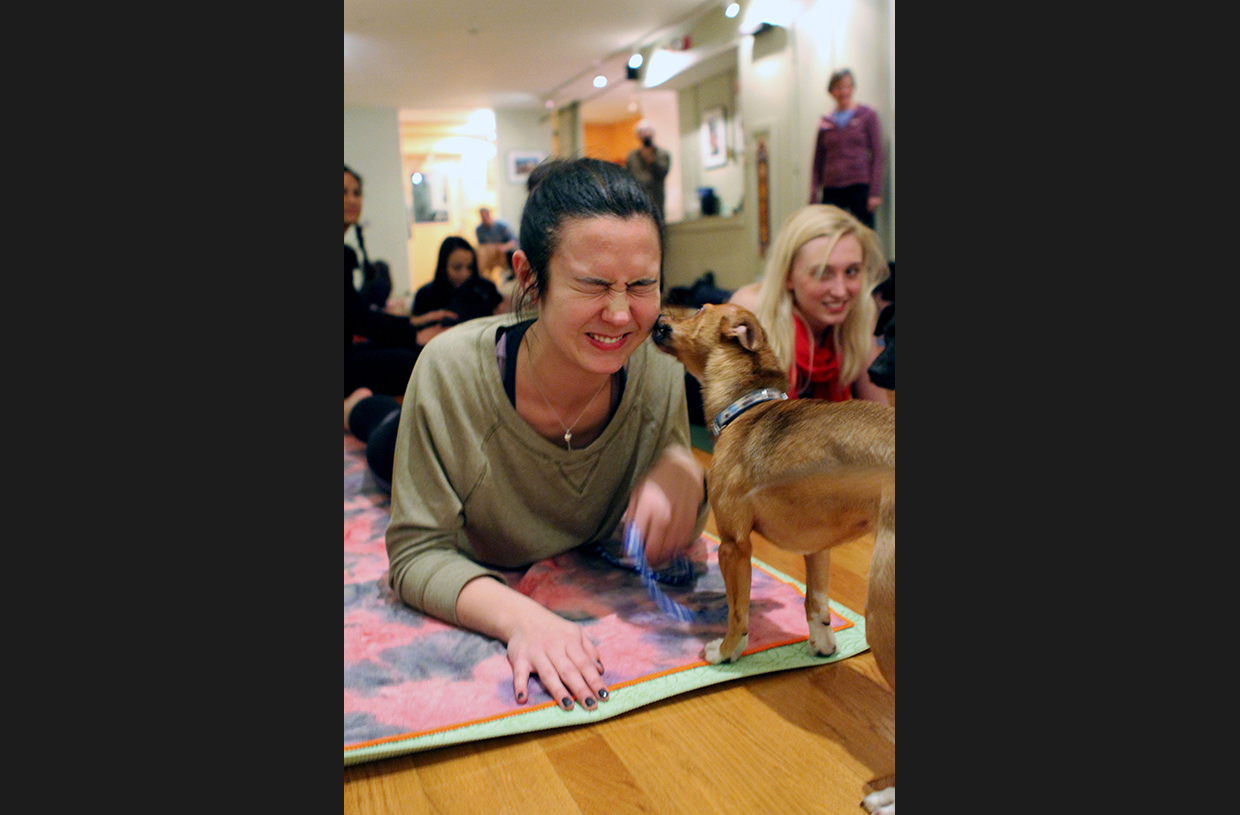 Photo 1: For a charity event benefitting the Animal Rescue League, Patrice Flesch put on a series of classes at her studio on February 11th that ran from 9 a.m. to 6 p.m., the last of which allowed dogs to participate with their owners. Flesch, who previously taught one experimental dog yoga (or 'doga') class before, adapted specific poses to be canine-friendly.