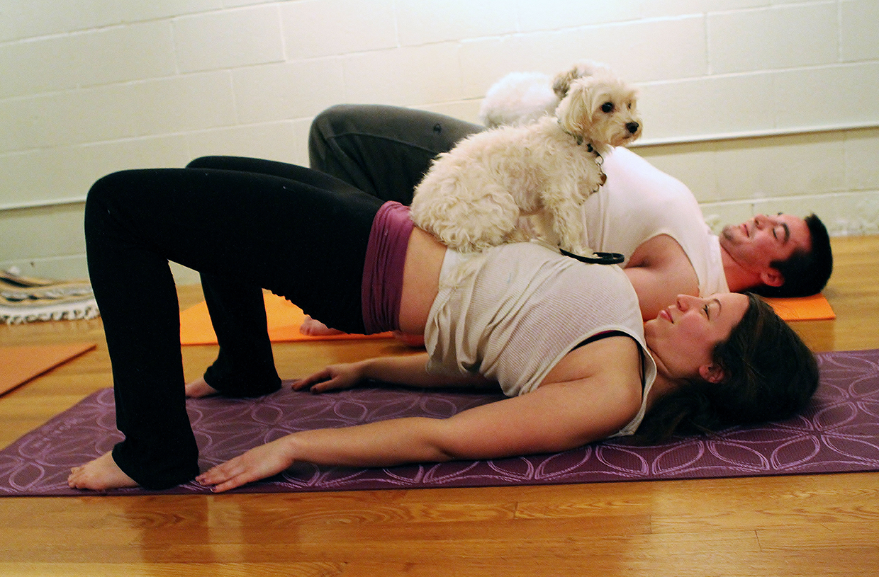Sophie Besl and Jack Crowley, both of the North End, balance Moose and Wilbur in the bridge pose.